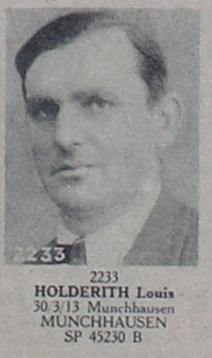 Non trouvé dans la base VDK, pour Mémoire des Hommes: HOLDERITH Louis Né le 30/3/1913 à Munchhausen (67 – Bas-Rhin, France) Mort pour la France le 1/8/1944 à Galinai (Allemagne), sans doute Galiniai en Litunaie, 34km au nord-est de Sudauen/Suwałki et 45km au sud-ouest d’Alytus à la frontière entre la Lituanie et la Pologne. Le secteur postal FPN 45230 B mentionné sur ses fiches DRK et MdH correspond à la 5. Kompanie du II. Bataillon du Grenadier-Regiment 432 de la 131. Infanterie-Division. Créé le 15 octobre 1942 par renommage de l’Infanterie-Regiment 432, le Grenadier-Regiment 432 est subordonné à la 131. Infanterie-Division. À cette date, le Grenadier-Regiment 432 est basé dans la région de Troitsky, au nord de Kirov, où il stationne les mois suivants. Le 1er février 1943, le Grenadier-Regiment 432 est dissous et ses éléments résiduels transférés aux Grenadier-Regiment 431 et Grenadier-Regiment 434. Reconstitué le 1er mai 1944 à partir du Grenadier- (Feldausbildungs-) Regiment 565, le Grenadier-Regiment 432 assure la défense au sud de la ville de Toula sur la rivière Turi. Dans la nuit du 6 juillet 1944, le saillant de Kovel est abandonné ainsi qu’une position stratégique appelée « Ilse-Stellung ». La 131. Infanterie-Division est retirée du front et, à partir du 10 juillet 1944, transférée par voei ferrée via Kholm et Bialystok à Varena-Mercinkance. À partir du 12 juillet 1944, le Grenadier-Regiment 432 est déployé le long de la voie ferrée reliant Vilnius à Grodno. Dans la nuit du 13 juillet 1944 et après de violents combats défensifs, le Grenadier-Regiment 432 se repli sur Puchacze sur la rive nord de la Mereczanka. La nuit du 14 juillet 1944, le Grenadier-Regiment 432 se retir derrière la Memel/Memele, où passe désormais la ligne de front. Le 14 juillet 1944, la 131. Infanterie-Division se replie davantage et se retrouve à l’ouest de Memel/Klaipeda le 15 juillet 1944. Les 16 et 17 juillet 1944, toutes les tentatives soviétiques de franchir la Memel/Memele sont repoussées. Le 18 juillet 1944, des unités soviétiques parviennent à franchir la Memel/Memele dans le secteur de la 131. Infanterie-Division et établissent une petite tête de pont, agrandie le 19 juillet 1944. La 131. Infanterie-Division réussit cependant à l’isoler. Le 20 juillet 1944, le III. Bataillon du Grenadier-Regiment 432 est dissous suite à de lourdes pertes. Le 28 juillet 1944 débute la grande offensive soviétique sur Memel/Klaipeda. À la fin de la journée, le Grenadier-Regiment 432 est contraint de se retirer de ses positions. Le 3 août 1944, le Grenadier-Regiment 432 se replie en subissant de lourdes pertes sur la position de défense de Prusse orientale n°I près de Becelly au nord de Sudauen/Suwałki, où le front s’immobilise et les attaques s’apaisent. Le 16 octobre 1944, de nouvelles attaques soviétiques contre les positions tenues par le Grenadier-Regiment 432 commencent. Le Grenadier-Regiment 432 est contraint de se replier à nouveau les jours suivants et occupe la position de Rominten près de Rappenhöh, le 23 octobre 1944. Début novembre 1944, le Grenadier-Regiment 432 participe à l’attaque de Goldap, reprise le 5 novembre 1944. La 131. Infanterie-Division est ensuite déployée le long de la ligne Augustowo-Goldap-Schlossberg et le long de la rivière Memel/Memele jusqu’à la lagune de Kurland/Courlande. Le 13 janvier 1945 débute la bataille de Prusse orientale. Les premières attaques soviétiques touchent le Grenadier-Regiment 432 le 18 janvier 1945, mais sont repoussées. Après la percée soviétique à Elbing dans le secteur de la 2. Armee, le Grenadier-Regiment 432 se retire de ses positions le 21 janvier 1945 et est contraint de se replier sur Guttstadt via Bischofsburg. Le Grenadier-Regiment 432 participe à l’attaque vers l’ouest menée par la 4. Armee afin de rejoindre le territoire du Reich. La zone de rassemblement du Grenadier-Regiment 432 se trouve dans la région de Guttstadt-Lingau. Le 26 janvier 1945 débute l’offensive allemande, qui reste bloquée jusqu’au 28 janvier 1945. Fin janvier 1945, l’attaque vers l’ouest est stoppée et la 131. Infanterie-Division passe en défensive au sud de Wormditt. L’encerclement de la Poche de Heiligenbeil/Mamonovo est ainsi scellé. Les jours suivants, la Poche se rétrécit de plus en plus, contraignant le Grenadier-Regiment 432 à des replis constants. Dans la nuit du 9 février 1945, le Grenadier-Regiment 432 se replie sur la ligne Wormditt – Korbdorf – Wagten, puis le lendemain sur la ligne Gut Grosse Grünheide – Gut Kleine Grünheide – Krickhausen – Wormditt. À partir du 15 février 1945, le Grenadier-Regiment 432 est positionné le long de la ligne Langwalde – Kleine Körpen – Grosse Körpen – Mehlsack. Le repli se poursuit les jours suivants, si bien que, le 1er mars 1945, les éléments résiduels du Grenadier-Regiment 432 sont positionnés le long de la route Gut Strauben – Blumberg – Breitlinde – Lilienthal – Katzenzagel, au sud de la ligne Schönlinde. En mars 1945, le Grenadier-Regiment 432 est définitivement dissous et ses survivants intégrés à la 170. Infanterie-Division.