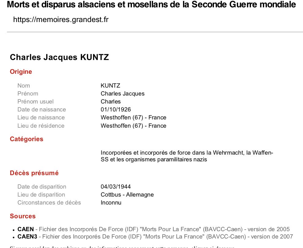 Charles Kuntz est décédé le 04.03.1944 à Cottbus, au sud de Berlin, sans doute dans un Lazarett car, à cette date, il n’y avait pas encore de combats dans cette région là.