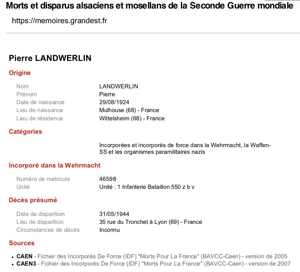 Je souhaite recons­ti­tuer le parcours de Pierre Roger LANDWERLIN. Il est né le 29 août 1924 à Mulhouse, et il est décédé le mercredi 31 mai 1944 à 20 ans. La photo ci-contre aurait été prise en Sicile. Incor­poré de force, il aurait été sous-mari­nier, puis déser­teur, envoyé sur le front russe afin de démi­ner certaines zones et appa­rem­ment il aurait sauté sur une mine. Pierre dessi­nait très bien, et jouait du violon. Il a été reconnu « Mort pour la France ». Ses parents étaient Charles LANDWERLIN et Olga Frédé­rique STENZEL.