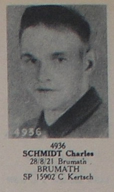 D’après Mémoire des Hommes: SCHMIDT Charles Né le 28/8/1921 à Brumath (67 – Bas-Rhin, France) Mort pour la France le 16/1/1944 à la colline/côte 95-1, au nord de Bulganok (Indéterminé): il s’agit ici de Bulganak au nord de Kertsch/Kerch dans l’est de la Crimée, Ukraine actuelle. Le champ de volcans de boue de Bulganak est situé 8km au nord de la ville de Kertsch/Kerch, ville située sur la péninsule du même nom, 245km à l’est de Sebastopol. Numéro matricule: 958 Instruit au sein de la Stammkompanie de l’Infanterie-Ersatz-Bataillon 385 stationné à Böhmisch Leipa/Česká Lípa en Tchéquie actuelle. Formé au sein du Grenadier-Ersatz-Bataillon 342 stationné à Neuhaus/Jindřichův Hradec près de Budweis/České Budějovice en Tchéquie actuelle. Muté au sein de la 2. Kompanie du I. Bataillon du Grenadier-Regiment 290. Le secteur postal FPN 15902 C mentionné sur sa fiche DRK correspond bien à la 2. Kompanie du I. Bataillon du Grenadier-Regiment 290 de la 98. Infanterie-Division. D’août 1942 à février 1943, la 98. Infanterie-Division combat en Russie sur la rivière Vorya, entre Temkino/Tyomkino et Gchatsk/Gzhatsk/Gagarin 239km au nord-est de Smolensk. Formé le 15 octobre 1942 à partir du 290. Infanterie-Regiment de la 98. Infanterie-Division d’infanterie, le Grenadier-Regiment 290 combat en Russie dans la région de Gchatsk/Gzhatsk/Gagarin 239km au nord-est de Smolensk jusqu’en janvier 1943, date à laquelle le I. Bataillon du 289. Grenadier-Regiment est incorporé au nouveau III. Bataillon. Le Grenadier-Regiment 290 combat ensuite dans le secteur de Spass-Demensk, 274km au sud-ouest de Moscou. En mars 1943, la 98. Infanterie-Division se replie sur la ligne Spass-Demensk-Dorogubush/Dorogobuzh, ville située 82km à l’est de Smolensk et 289km à l’ouest-sud-ouest de Moscou. La 98. Infanterie-Division est ensuite retirée du front et déployée d’avril à mai 1943 pour combattre les partisans dans la forêt de Mamajewka/Mamaïevka, entre Brjansk/Briansk/Bryansk et Roslawl/Roslavl, 106km au sud-est de Smolensk. À l’été 1943, le Grenadier-Regiment 289 est dissous et est rebaptisé Divisions-Bataillon 98. En juin 1943, la 98. Infanterie-Division est embarqué sur voie ferrée et dirigée vers Feodosia en Crimée, d’où elle progresse vers la tête de pont du Kouban entre Krasnodar et Stavropol. En juin-juillet 1943, le Grenadier-Regiment 290 est transféré dans le secteur sud du Kouban, puis se replie sur la péninsule de Crimée. De coûteuses batailles défensives s’ensuivent près de Krymskaïa 78km au nord-ouest de Krasnodar, jusqu’à l’évacuation définitive de la tête de pont du Kouban en octobre 1943. De novembre 1943 à avril 1944, la 98. Infanterie-Division livre d’intenses combats défensifs sur la péninsule de Kertch. De janvier à début avril 1944, la 98. Infanterie-Division combat dans le secteur situé entre Mama-Russkaja et Bulganak au nord de Kerstch/Kerch 245km à l’ouest de Sebastopol/Sevastopol. Le 1er mars 1944, le Grenadier-Feldausbildung-Regiment 615 est affecté à la 98. Infanterie-Division comme troisième régiment et ensuite renuméroté Grenadier-Regiment 289. D’avril à mai 1944, le Grenadier-Regiment 290 retraite avec l’ensemble de la 98. Infanterie-Division vers Sewastopol/Sébastopol, où la plupart de la 98. Infanterie-Division est détruite le 10 mai 1944. La 98. Infanterie-Division est réorganisée le 5 juin 1944 près d’Agram/Zagreb en Croatie, à partir des éléments résiduels de la la 98. Infanterie-Division et de l’état-major de la 387. Infanterie-Division. Les survivants du Grenadier-Regiment 290 sont rapatriés en Roumanie par voie maritime puis transférés à Zagreb/Agram en Croatie : le Grenadier-Regiment 290 y est recréé le 05 juin 1944 et composé de deux bataillons. En juillet 1944, la 98. Infanterie-Division nouvellement formée est envoyée en Italie et prend en compte la défense côtière de Ravenne. En août et septembre 1944, le Grenadier-Regiment 290 est alors déployé comme le reste de la 98. Infanterie-Division et participe aux combats autour de Rimini et retraite ensuite en traversant les Apennins jusqu’à la rivière Senio. Le Grenadier-Regiment 290 se fraye un chemin de retraite depuis Rimini à travers les Apennins jusqu’à la rivière Senio. De janvier à avril 1945, une intense guerre de tranchées a lieu sur la Senio près de Lugo. En avril 1945, le Grenadier-Regiment 290, comme la 98. Infanterie-Division, retraite par la plaine du Pô, via Istrana, Coruda et Belluno jusqu’aux contreforts des Alpes, où l’ensemble capitule près de Pieve di Cadore en mai 1945 et est capturé par les troupes américaines.
