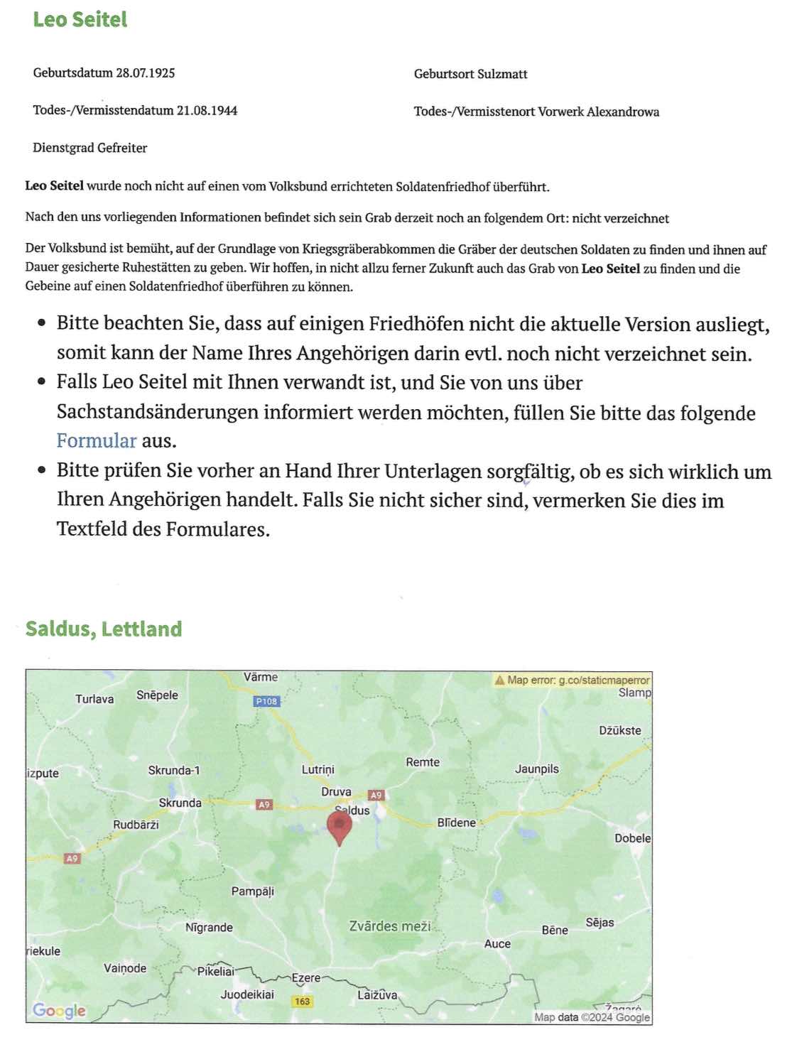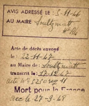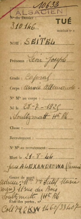 Léon Joseph Seitel (* Soultzmatt 28.7.1925) faisait partie de la 3e compagnie du Panzergrenadier Regiment 14 (FPN 34502). Sa dernière lettre est datée du 20.8.1944. Il est mort au combat le lendemain, le 21.08.1944, à Alexandrowa, en Lettonie. Mort pour la France.