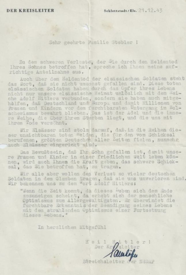 Albert, le deuxième fils, a également été incorporé dans l’armée allemande. Déserteur, il s’est fait rattraper. Il était en partance pour le camp de concentration du Struthof/Natzwiller quand il a pu sauter du train. Il a été caché aux Pays-Bas jusqu’à la fin de la guerre par un couple avec qui il est toujours resté en contact.