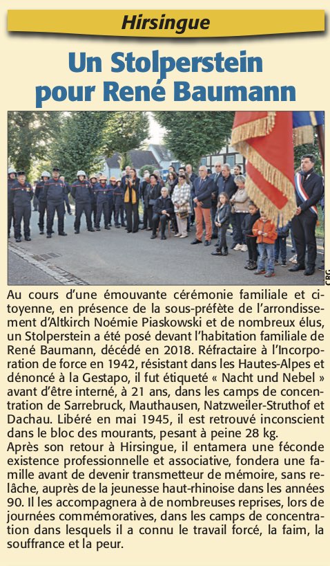 Stol­per­stein : René Baumann, réfrac­taire à l’in­cor­po­ra­tion de force et déporté – Article paru dans « L’Ami hebdo » du 19.10.2025