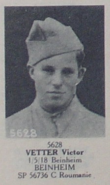 Non trouvé dans la base VDK, pour Mémoire des Hommes: VETTER Victor Né le 1/5/1918 à Beinheim (67 – Bas-Rhin, France) Porté disparu à Cemiceni/Cimișeni le 10/8/1944 et déclaré Mort pour la France le 30/8/1944 en Roumanie Le secteur postal FPN 56736 C mentionné sur sa fiche DRK correspond à la 2. Kompanie du Feldersatz-Bataillon 294 de la 294. Infanterie-Division. Après avoir combattu au nord d’Odessa jusqu’en mai 1944, ce bataillon combat à partir de juin 1944 et est anéanti en août 1944 dans la région sud de Kischinew/Chișinău en Moldavie. Cimișeni se situe en Moldavie 22km à l’est de Kischinew/Chișinău.