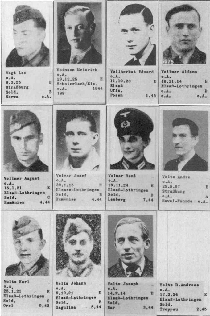 Vogt Léon, Voin­son Henri, Voll­herbst Edouard, Voll­mer Alphonse, Voll­mer Auguste, Volmar Joseph, Volmar René, Voltz André, Voltz Charles, Voltz jean, Voltz Joseph, Voltz R. André